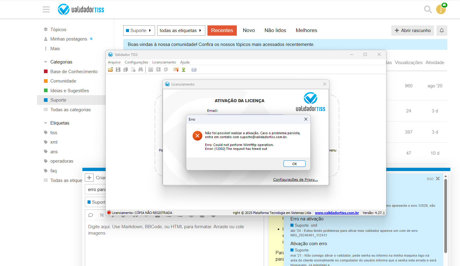 Há alguma restrição na sua máquina ou rede que está impedindo o Validador de conectar-se aos nossos servidores para realizar a ativação da licença (ex: antivírus, proxy, firewall, etc). Nesse caso, você deve pedir auxílio a sua equipe de T.I.