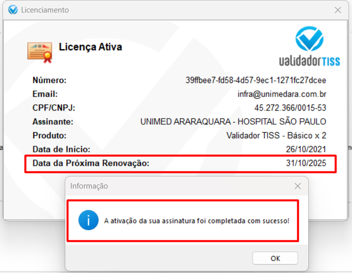 Deu certo, porém a licença está com vencimento amanhã, 31/10/2025, e nosso plano é anual.